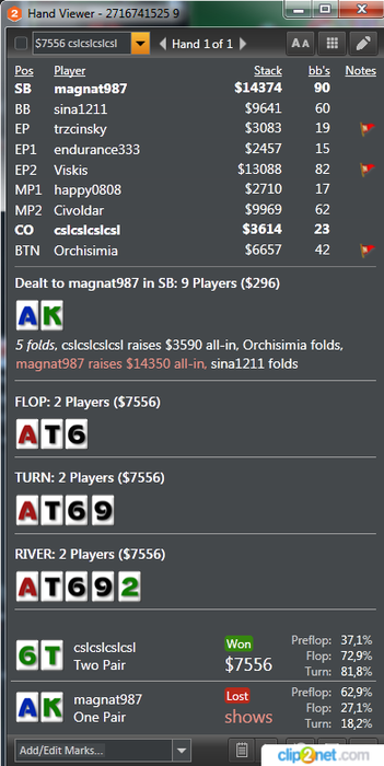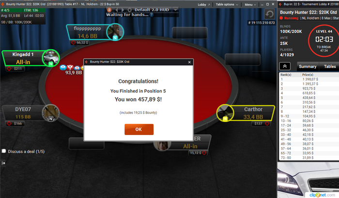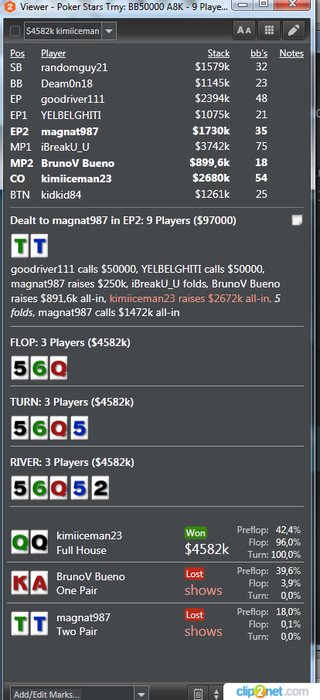 Были неплохие проходки в биге 22, нокауте 20 на ес и финалка по 5,5 на пати. Затащить не смог. Отыграл сегодня турниров: 32 АБИ: 13.2$ Результат: +395$