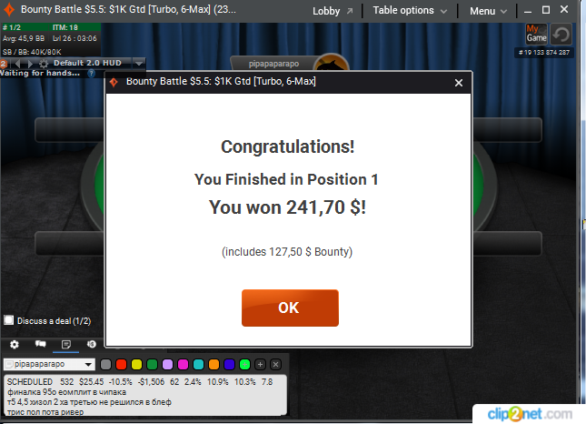 Смешанные чувства после игрового дня. Была финалка билдера на пати по 22, уехал седьмым. На пс занял второе место в 5.5 ПСКО, вынес 4-5 человек с финалки и проиграл в ХА. Или соперник на 5 голов был выше, или заходило ему знатно. Отыграл сегодня турниров: 30 АБИ: 9,4$ Результат: +312$