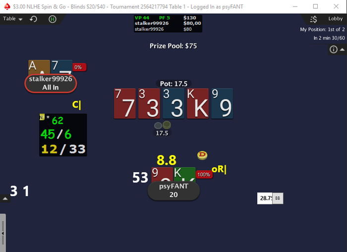 Из-за резкого повышения атмосферного давления чувствую себя дурно под вечер.. Пару столов отчебучил и слил, после чего резко закрыл регистрацию - катать дальше мой организм НЕ настроен.. То ли из-за утренних йога-тренировок, то ли из-за 3х питание - сидеть тяжело