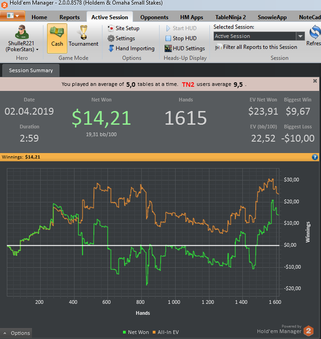 Hero (SB): $14.32 (143.2 bb)BB: $18.04 (180.4 bb)MP: $8.73 (87.3 bb)