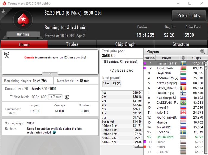 Poker Stars, $0.05/$0.10 Pot Limit Omaha Cash, 6 Players