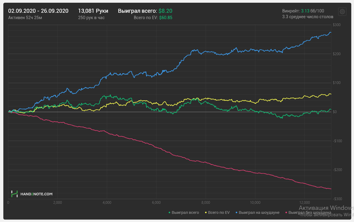 Анте 5Начал мес именно с анте 5. Первые +-5к рук пошли уверенно. Плюсовал почти 100$ по EV, но начал мудить (по другом не скажешь) с кешаутом. В итоге плюсовал по EV +100, а по факту летел в -100$ примерно через 10к рук. Был дикий тильт, но понимал, что уже начал делать миссию на рейк и обратного пути нет. Решил играть онли анте 5 до талого, пока не сделаю миссию. Играл 2 стола, потому что на 4 чувствовал себя не уверенно. Да и вообще думаю пока что анте 5 я не бью, хотя в итоге и отыграл его не в минус. Миссию доделал, получил 200$. Хотел выполнить 2 раза, но не смог, потому что не закрепился норм на пятерках и просто понимал, что если начну сейчас гриндить (смешно) 4 стола на пятерках просто залью больше, чем сама миссия даёт.