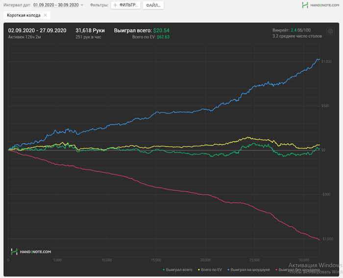 Миссия:График Анте5:Анте 2Двойки отыграл не много, опять же по причине того, что начал миссию делать и на двойках просто не наиграю столько, сколько необходимо. В октябре буду гриндить онли двойки, и поднимать винрейт по EV хотя бы до 50бб на 100, сейчас винрейт 23 EVбб на 100.