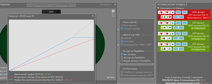 Вот пример на фото, я сыграл 4 раздачи, выиграл 3 раза по 43,70 и раз проиграл 43,70.