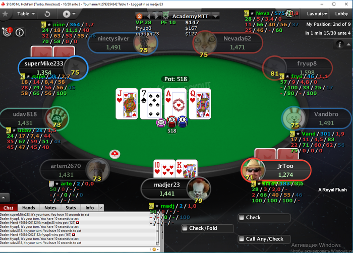 Madjer23 @ 27.1.2020 Играю я такой ХА с отбитым фишом со статами 60/40/30. Пушу в него своего туза, он задумался что-то, включил таймбанк. Я сижу и думаю, что ж там он так думает. До этого же все фишные решения моментально принимал. В итоге он израсходовал весь тайм-банк и нажал кнопку колл.