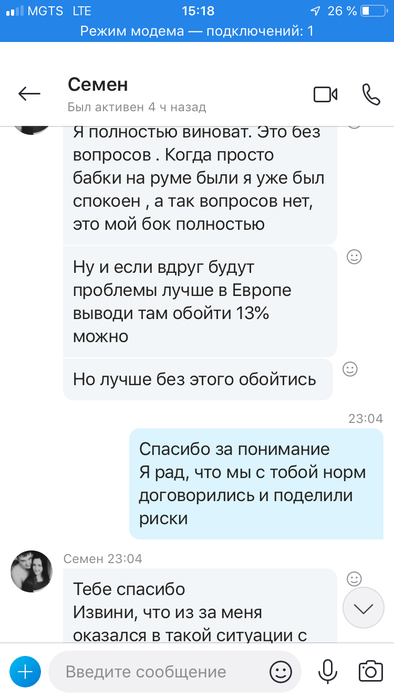 p.s. Была ли бы здесь эта тема, если бы компенсация составила 2-5к$ к комиссии, очень сомневаюсь. Этично ли забирать такую сумму в счёт компенсации после того, как все закончилось относительно хорошо (предупреждение, но снятие бана без каких-либо штрафных санкций )? Но изначально именно она была озвучена в процессе переписки, или на ваш взгляд, по окончанию ситуации Гамп должен был вернуться к обсуждению возможного уменьшения? Со стороны ТС, как я понимаю такого предложения не было ( было озвучено желание, после консультации с дольщиками, получить всю сумму целиком (25к)) Интересно было бы послушать людей, которые постоянно осуществляют обмены на похожие суммы (как развернутый комментарий konccccc на 15ой странице)