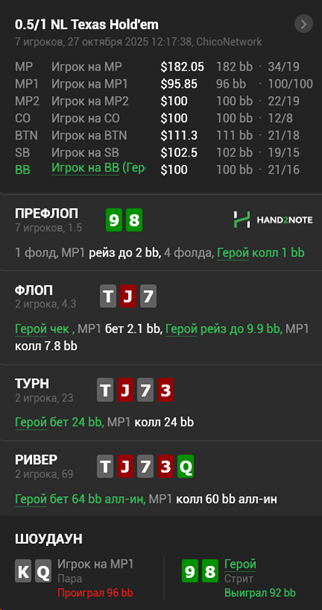 Да, у оппонента доехало несколько комбодро в виде АК, К9 - это всего лишь 4 комбинации, т.к. я ставил крупный рейз на флопе и потбет на терне. Предполагаю, что просто гатшоты без флешдро фолдят на такой экшн, но можем записать в «доезды» не 4 комбы, а условно 6. Делая предположение, что очень редко АК будут играть кол терна и без фд. Комбы с которых мы добираем - сеты 77, 1010, JJ, QQ - они все есть и это 12 комбинаций, учитывая экшн они иногда сыграют 3бет на флопе (рейз нашего чек-рейза), или запушат на терне, они могут и сдаться на ривере поверив в наш стрит.. По этому в реальности в колле Алл ина этих комбинаций будет не 12, а сильно меньше.. Штуки 4-5. Так же есть все оверпары КК, АА - это ещё 12 комбинаций. Но учитывая экшн, то в кол можно записать 2-3 штуки. Есть доезды в KQ, AQ. По сколько на доске было два флешдро и мои ставки были крупные, я предполагаю, что кол терна играют только комбинации с флешдро, то есть 4 штуки, на ривере Q крестовая не поблочила эти 4 комбинации червовые и пиковые, по этому на наш пуш «по шансам банка» или «от безысходности» эти комбы в половине раз точно сыграют кол. Плюсуем ещё 2 комбинации. Итого уже 8-10 комб, которые мы бьем и добираем с них 64бб против 6 комбинаций, которым мы проигрываем. И это даже я ещё не считал возможные 2 пары у оппонента. Итог: мы имеем вельюпуш на ривере!