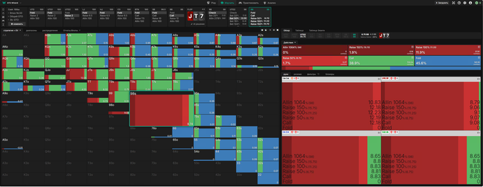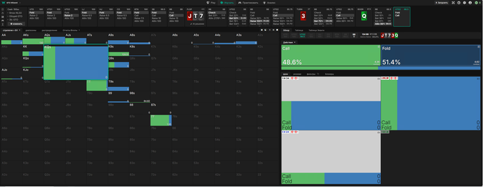 Первым делом я хочу показать, как в подобной ситуации играет GTO Wizard. Понятное дело, что эта информация в реальной жизни будет не оптимальная, т.к. GTO играет против такого же сбалансированного GTO. А я играл первую или вторую раздачу за столом, и мой оппонент для меня был полностью неизвестный.