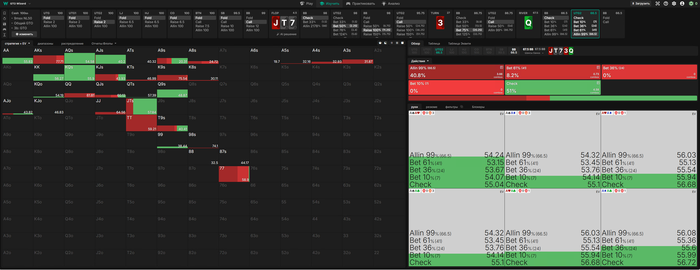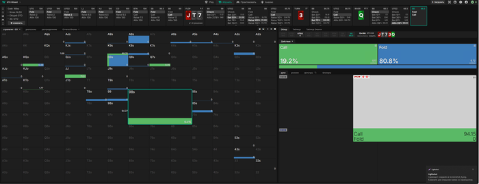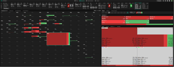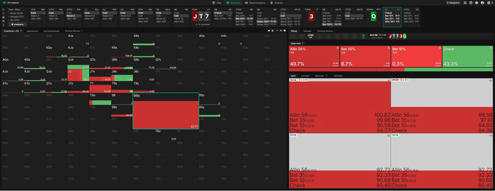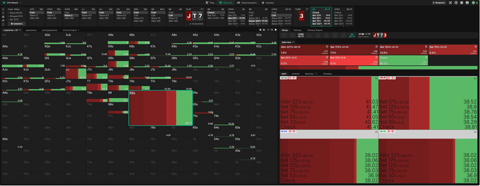 Если мы поставили на терне 75%, то всё равно GTO выбирает пуш. Очень редко чекает 98 червей. Очевидно для защиты чека, чтобы с этой комбинацией сыграть чек-кол. У оппонента много флешдро с флопа, которые мы не блокируем и которые предположительно могут в нас поставить все фишки в блеф.