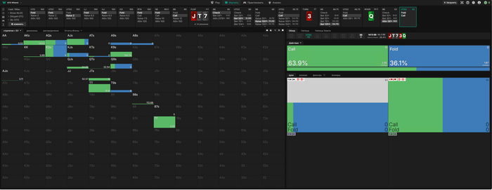 Ну и если вдруг мы решили на ривере сыграть чек, то стратегия Wizard'a такая: KQ - чекается в догонку. На велью пушит стриты, сеты, лучшие две пары. В блеф - блокеры на стриты. Иногда даже с парами - AJ, KJ, 109.