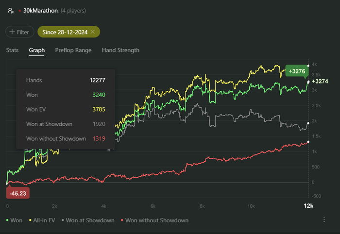 + я мега резалт-ориентед. Возможно поэтому неделя вышла хорошая типа 12к рук, но в целом это такой подход, что ведет к срыву к лудке. Так что эту неделю ставлю себе основную задачу не обращать внимание на графики, а обращать внимание на споты которые вызвали во мне дискомфорт или неуверенность.
