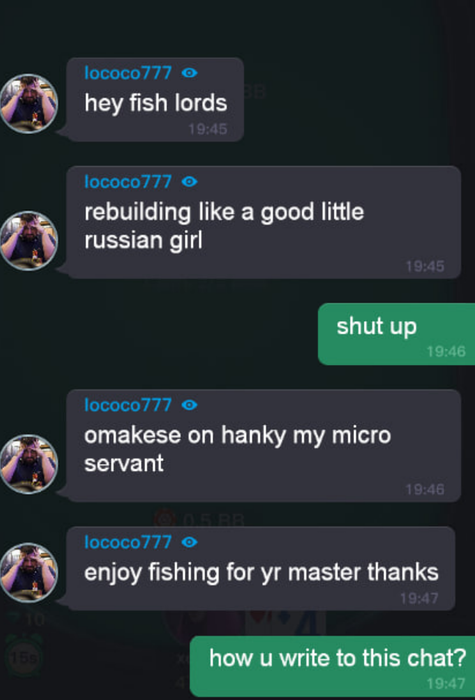 Оказывается это не оппонент писал в чат, а это уебище. Хуй знает как он пишет в чужой чат, но это настораживает.