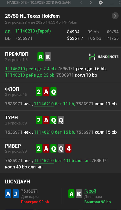 Я делаю логические ошибки. Я хорошо привожу диап к риверу оппонента но что то внутри щелкает что-то по типу "Только алыном мы тут заберем банк" "НАДО ЗАБРАТЬ ЕБУЧИЙ БАНК" Видимо это давление денег жестко сказывается. Как же я хочу уничтожить этих двух мразей. Но бр жестко не позволяет играть в агейм свой.