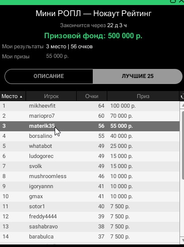 Начал играть мини РОПЛ на ПД. Обидно в одном турике вылетел на 11 месте, очень обидно. В одного и того же чувака ехал две пары против пары, оба раза ему доезжала вторая пара. Ну да ладно, это был первый день всего лишь, еще доеду. Удалось ворваться в топ 10 лидерборда по нокаутам, правда сегодня думаю просяду, не умею играть ананасы, даже правил не знаю, но другие 2 турика сыграю. Этот лидерборд заставляет играть с самого начала.