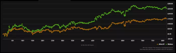 Тем временем бр приближается потихоньку к 100би. Стало не много проще играть лузовее в не которых ситуация, но в 100бб+ по прежнему чувствую себя ужасно. Там где нужно поднажать, выбираю пасивную линию. Очень много велью упускаю при глубоких стеках. Чисто сижу под фиша, с регами не борюсь, только на велью, пока работает.