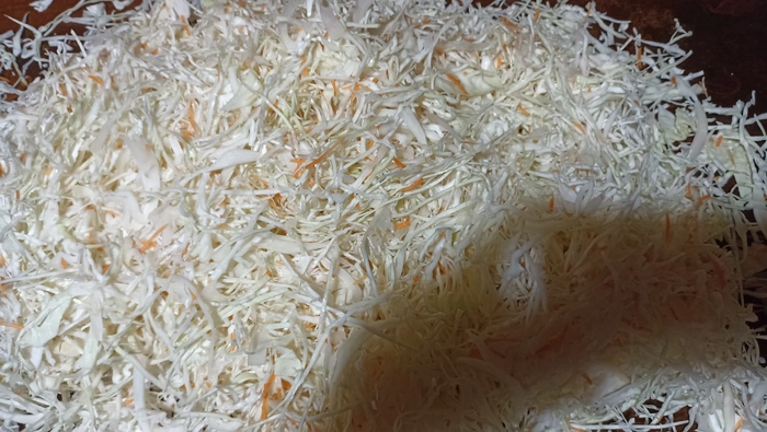 На 3х литровую банку- 1 капуста, сочная, с горчинкой( сорт Браво или Чемпион) нашинковать, 1 морковь и немного корня сельдерея на корейской терке. Перемешать.