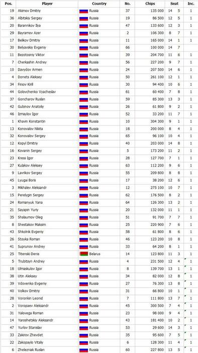 Результаты сателлита на High Roller Event Day 2. Было сделано 46 входов и разыграли 4 билета вместо двух. Плюс шестое денежное.