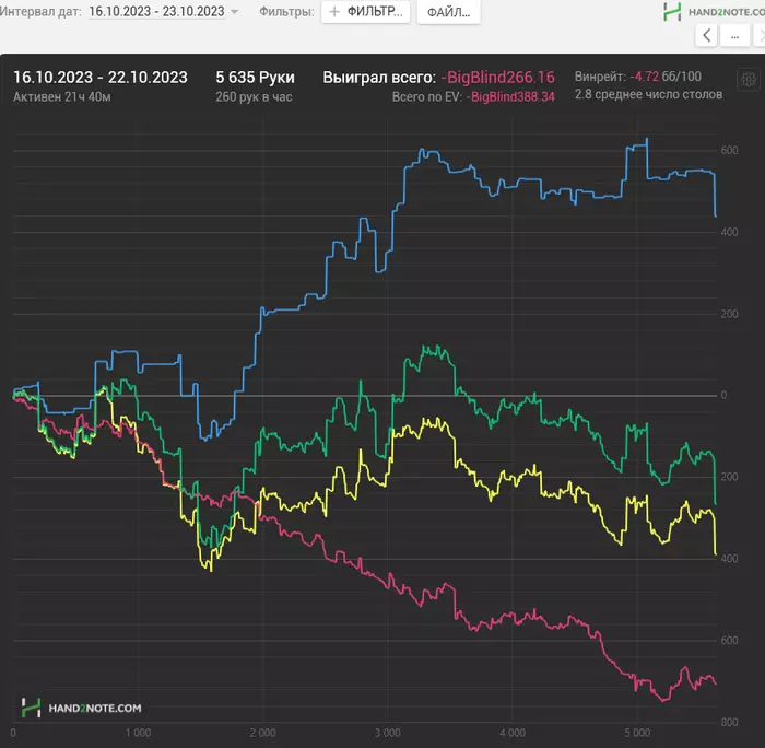 Пришло время подвести итоги очередной недели. Эта неделя получилось тоже минусовой. Уже третья подряд. На волевых продолжаю катать и работать над игрой. Моё почтение к проф. покеристам, которые разгребают такие ситуации и не опускают руки. С трудом понимаю как я буду это вывозить, если уйду с работы и буду полностью зависеть от заработка покером.