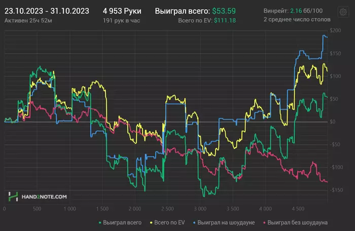Сам месяц получился минусовым по факту и околонулевым по ЕВ. На самом деле не могу последних 1.5 месяца нащупать свою игру. Психологически тяжело, катаю и работаю на волевых. По факту у меня уже 40К рук минусовой результат. Накладывается по сути диспа и плохая игра. Тебе плохо сдает, проигрываешь, начинаешь подтильтовывать и вот ты уже не по страте сыграл несколько раздач и от этого еще больше подтильтовываешь. Вот это одно на одно накладывается и реально тяжко. Как из этого выходить профессионально я вообще ХЗ.
