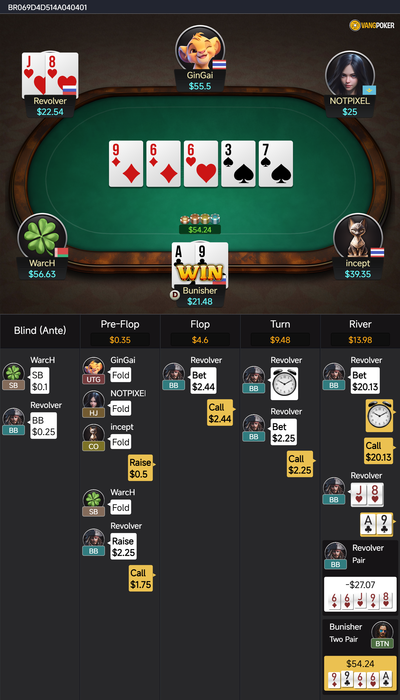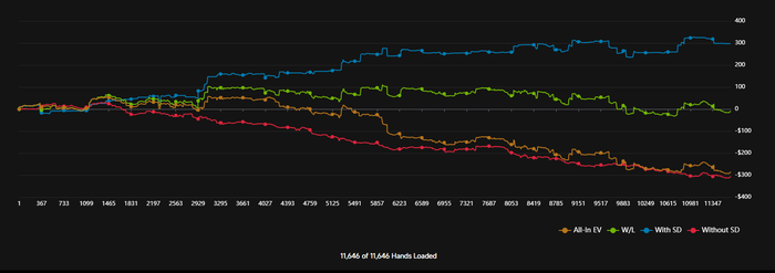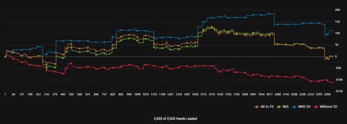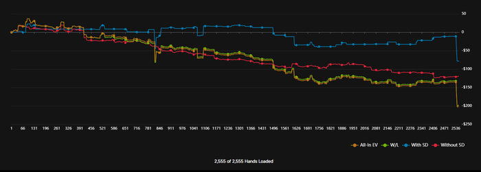 Отыграл 2.5к рук за 3,5 часа. Закончил пораньше. Вообще не было желания сегодня катать, видимо интуиция😅 Результат -222$. По перформансу худшая сессия, несколько раз случился брейн лаг. Это когда смотришь на одни карты, но мозг выдает другие, поэтому несколько стеков задонатил, и штук шесть кулеров. Решил закончить мучения на сегодня, хоть тильта и не было, но физическая форма и ран подвели. Поскидываю несколько раздачек с прошлой сессии, раз время освободилось.