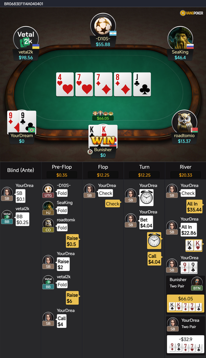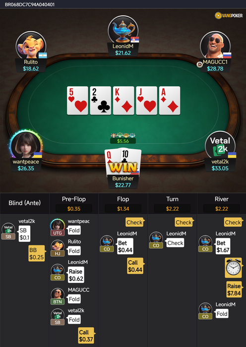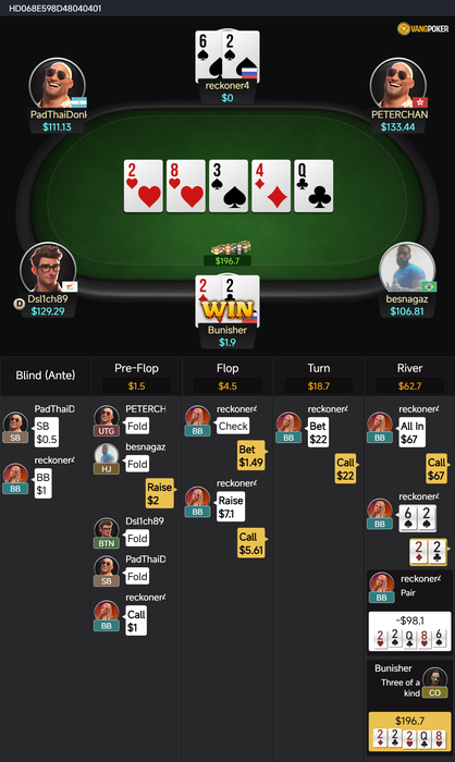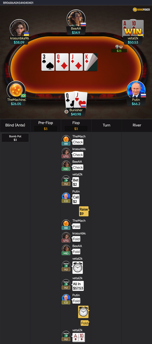 Vetal2k очень нитовый оппонент, на мой рейз флопа прилетел пуш в эффективных стеках 200бб. Я долго думал над колом, точно не понимал пролезет ли он против его диапа пуша, хорошо хоть руку показал.