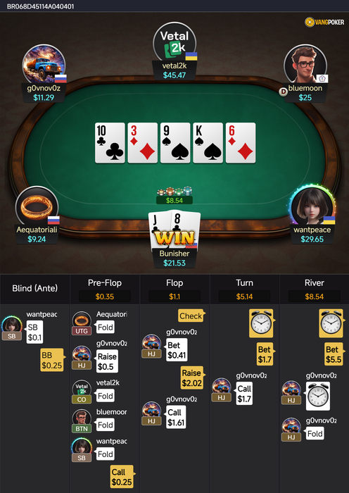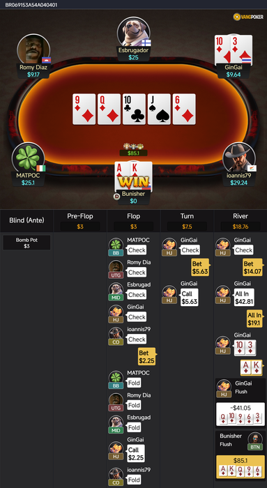 Заколил ривер из-за поломанной линии, не смог придумать достаточно велью, которое ставит 1/4 на терне и 1,5 банка на ривере, а блефов накидал достаточно.