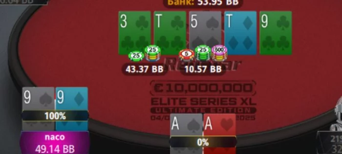 Я херачу овербет кбет 15бб, специально под его 14% фолда на кбет, просто потому, что на таком флопе оно никогда не выбросит Ахай, КД, ДВ, стрит-флеш дро и уж тем более совпадение по десятке, но ни секунды не думая оно запихивает в меня свои девятки.