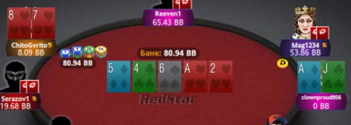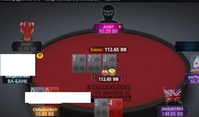 Выходит вот такой флоп. Мы кбет, соперник за спиной конский рейз, ББ - фолд.