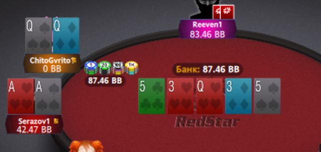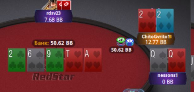 fortdw, готовый флеш со флопа ожидаем увидеть. Или AJo с пиковым тузом, который он хз зачем заколлил.