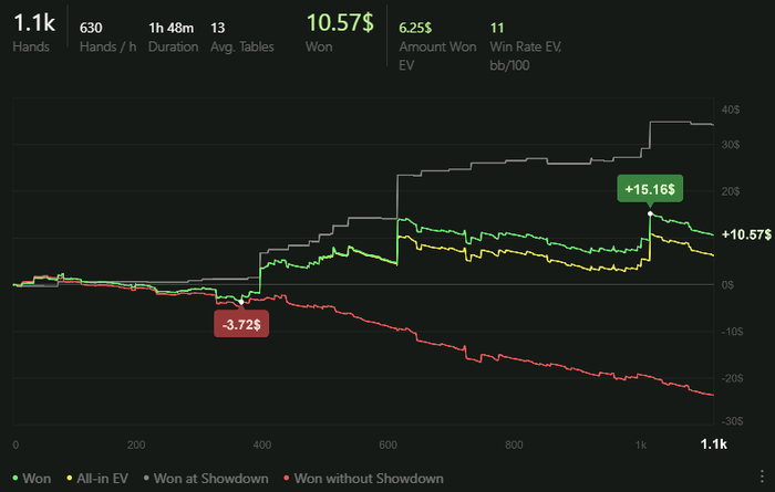 RUSH NL5. Сессия #9. Хотел закончить с NL5, но чувствую, что хочу еще одну сессию откатать и с большей уверенностью пойду на NL10. Не хотел график из ПокерКрафта выкладывать, но почему-то H2N разбил мою сессию на 4шт и в общем, я не смог найти фильтр чтобы их склеить. Выбирая текущий день, тоже показывал условно около нуля... Ерунда какая-то!
