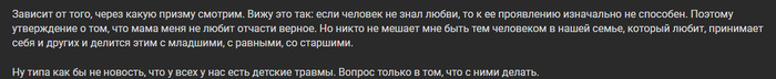 А правда заключается в том, что в школе не учат воспитывать детей, поэтому воспитывали, как могли, и любили, как могли. И получается, что если что-то не додали родители, надо добирать это самостоятельно. Если не долюбили - учись любить себя, не додали каких-то навыков - иди учись, и так далее.