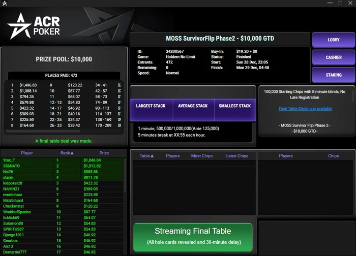 Давненько не играл в покер, но так как ACR сделал акцию по раздаче билетов, я получил один билет за 19$. Прошёл сат, попал на главный турнир и вылетел где-то в плюс 5$. Через пару дней опять получил такой же билет, снова попал на главный и остался доволен результатом. Ахринеть... 911 баксов)) Год заканчиваю на хорошей ноте