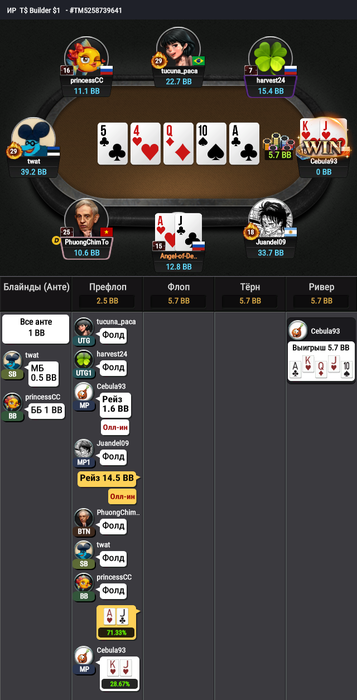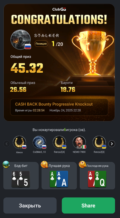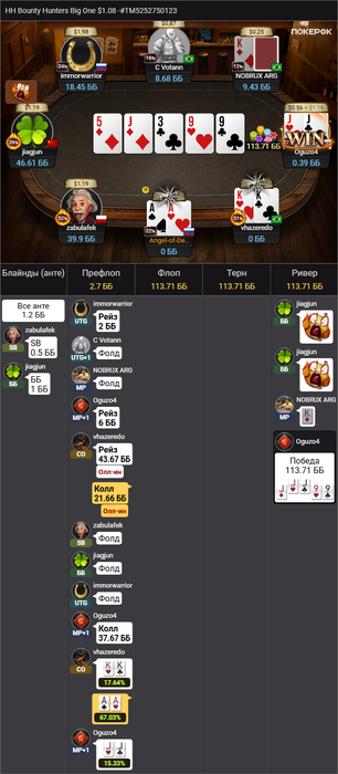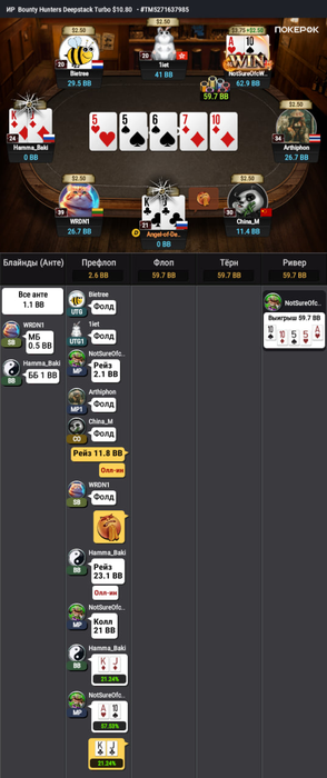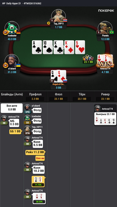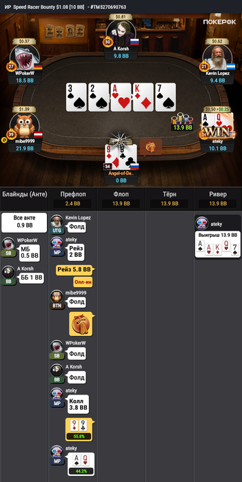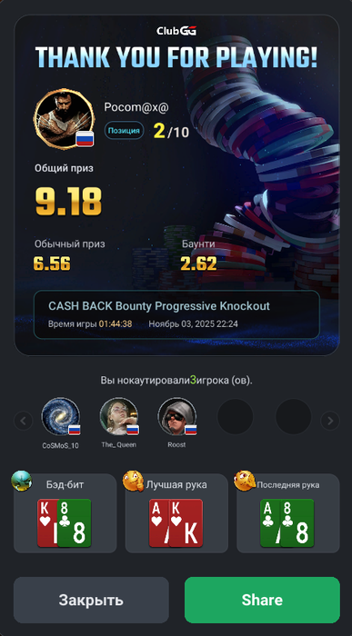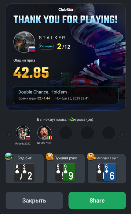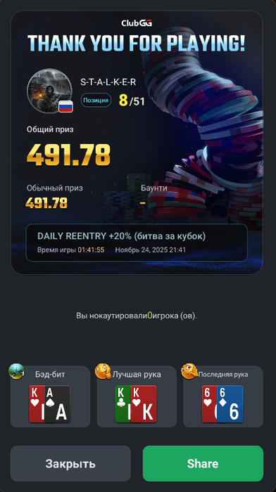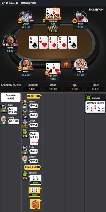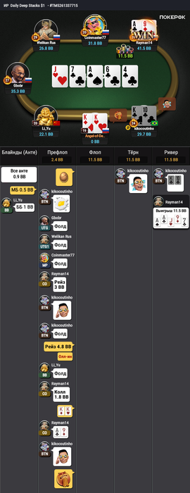 На ПОКЕРОК как обычно все мимо, выиграл огромный мультипот, сразу чипак 1/24 смогу реализовать лишь так. На ПОКЕР ДОМЕ вообще получилось неплохо. Загрузил турик в лайт реги в 12.5 бб и погнал крушить. Шёл 9 из 9 с 1.3 бб но смог крутануться и выйти на финалку, выжал все что смог. Результатом доволен. В клуюах результат не плохой, так же выжил все что мог. В первом случае выставление 44<AK, во втором поехали на флопе у меня сэт, против готового стрита + фд. Увы. Чую чую топ 1 близко)))🙏🦾
