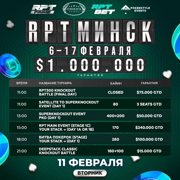 🕕 В 18:00 пройдет $260 БИТВА ПОКЕРОК (Stage) your stack — day 1. 20% участников пронесут свои стеки в целевой турнир.