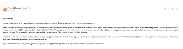 bAnanaStyle, тоесть письмо о блокировке пришло именно от сб гг а не от саппорта покерка?
