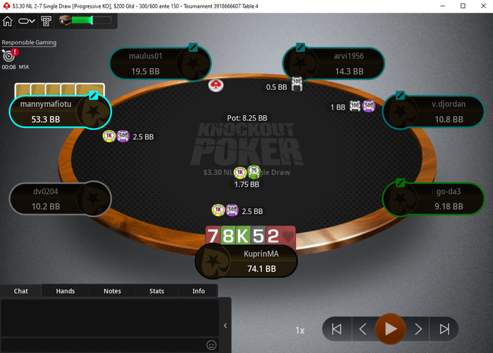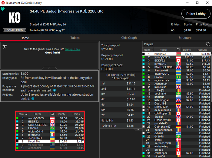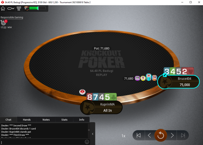 Сегодня после недельного перерыва сыграл дневной бадуги. Денег заработал немного, но отыграл отлично. Турнир запомнился тем, что в 3-мах у меня было 9 бб, а у двух оппов ровно по 115 бб. В итоге я умудрился раскрутиться и почти выиграл турнир, но в ключевой раздаче оппоненту всё-таки удалось наловить свою карту против моего стенда.
