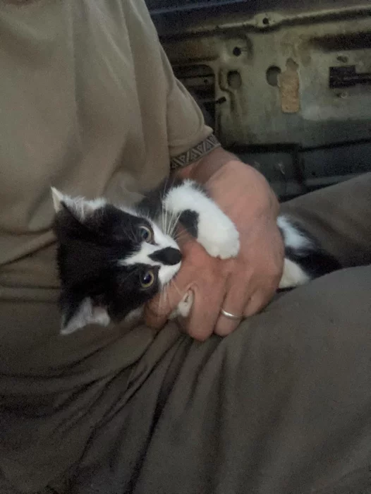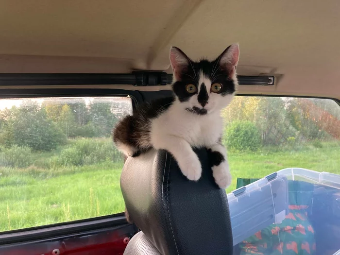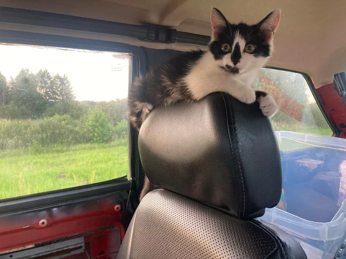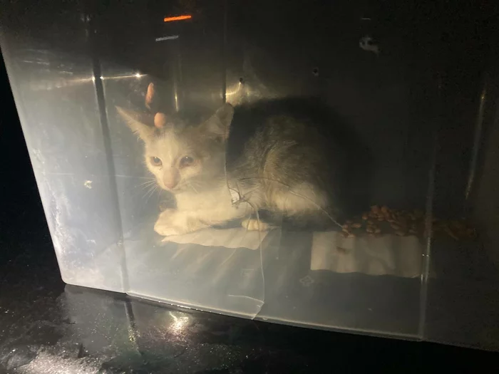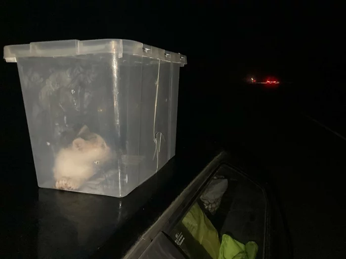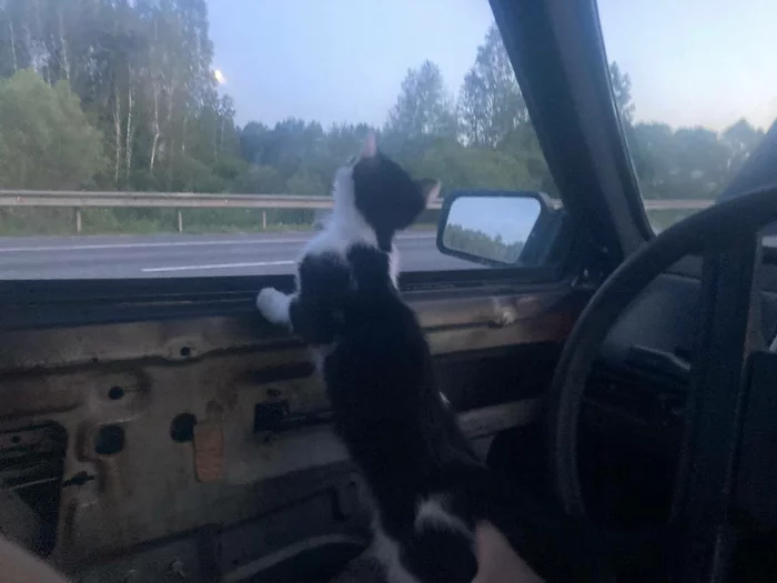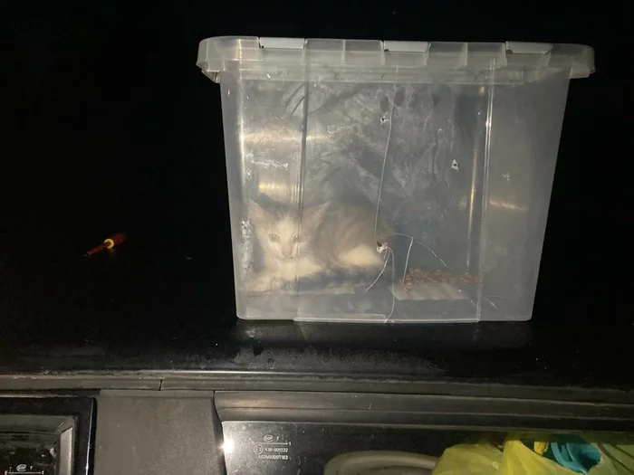 Когда уже совсем стемнело, я услышал как мяукает котёнок. В этот момент я как раз вышел из машины, и, естественно, первым делом подумал, что это замяукала Масяня, хотя она всё время вела себя спокойно. Подойдя к машине я увидел, что она спит, а мяуканье я слышал всё громче и громче. В этот момент я взял телефон и включил фонарик, и в темноте на обочине на свету увидел кошачьи глаза, которые от фонарика было хорошо видно. Маленький котёнок мяукал, но потихоньку шёл в мою сторону. Я был в шоке, так как в радиусе 50+ км не было ни одной жилой постройки. Как я уже понял позже, котёнка просто привезли и выкинули на обочину на верную смерть. И не смотря на и так не самое приятное положение, я понял, что его любой ценой нужно забирать. Здесь на обочине вдали от цивилизации он обречён. Пытаясь подойти поближе к нему, он сразу начинал убегать. В этот момент я вспомнил, что в машине есть Масянин корм и переноска. И нам очень повезло, что в машине оказалась переноска. Взяв корм и переноску, я пошёл ловить котёнка на обочине. Рассыпав корм, я сделал две неудачные попытки его поймать, т.к. он был очень испуган и сразу убегал, но я понимал, что оставлять его здесь - это будет означать его верную смерть в ближайшие дни или часы. Поэтому с третьей попытки мне удалось его схватить и закинуть в переноску. В этот момент он заголосил таким истошным криком, какого я никогда не слышал. Видимо, пережив уже одно предательство он подумал, что сейчас его просто убьют. Мне пришлось в ускоренном темпе делать в переноске отверстия для того, чтобы он не задохнулся. Я стал протыкать её отвёрткой, т.к. времени не было. И в один момент переноска треснула, но, к счастью, котёнок был сильно напуган и всё-таки не вырывался. Занести его в машину я тоже не мог, т.к. уже и Масяня была напугана появившимся посреди ночи мяуканьем, поэтому пол ночи мне пришлось стоять возле машины и придерживать рукой дырку в переноске, которая стояла на крыше. Когда за мной уже приехала помощь, мы оттащили машину с уже двумя котёнками на заправку и переложив все вещи с одной машины в другую поехали с пополнением в Добруш. Забирать второго котёнка в съёмную квартиру я не мог, поэтому пришлось оставить его возле подъезда с остальными дворовыми котятами. И, забегая вперёд скажу, что возле подъезда он быстро прижился и никуда не убежал. Первые дни я постоянно видел его и подкармливал, вместе с остальными. По нему было видно, что он прямо "ожил". Игрался с остальными котятами и постоянно тёрся мне о ноги, как будто узнавал своего спасителя.