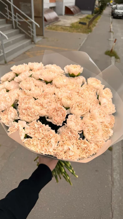 Видимо это произошло, пока нес цветы и повесил пакет с тортом на руку. У меня под домом есть очень крутой цветочный магазин, где я уже постоянный уважаемый клиент) Заказал 51 гвоздику на дату др, третьего числа привезли свежие и упаковали.
