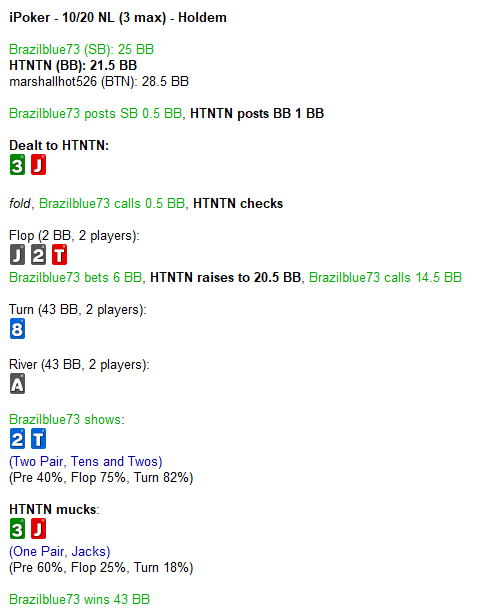 Оппонент - любитель, с которым было сыграно 5 рук. До этого играл опэном 7бб, там уже все ясно стало. Не знал что делать, в итоге не придумал ничего лучше, кроме того, чтобы запушить. Для колла доска показалась слишком опасной. Как здесь лучше играть?
