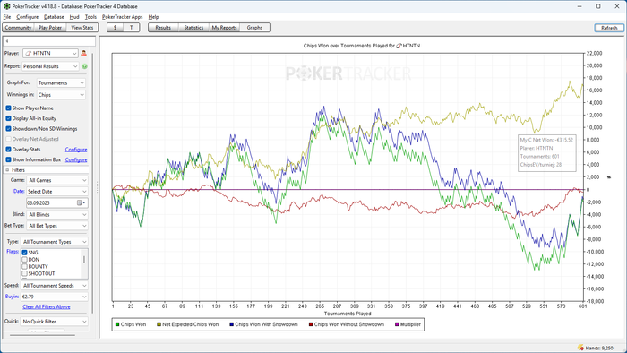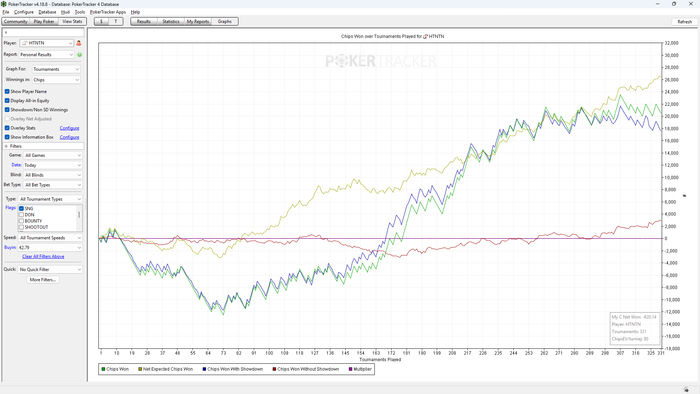 По множителям шло плохо, проиграл очень много бустов. Параллельно сыграл 2 мттшки на билеты, которые падали с фрироллов, в одной дошел до мистери стадии и проиграл 2 выставления подряд, в другой поехал префлоп 70 на 30 и тоже проиграл. В последнее время вообще никак не идут мттшки, пошла просадка на графике: