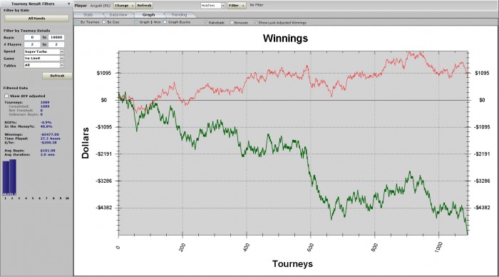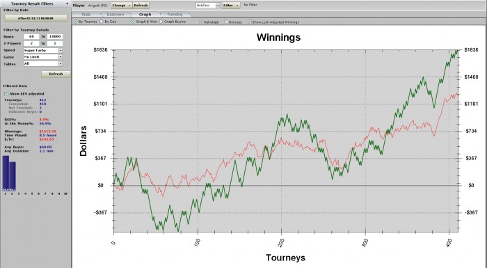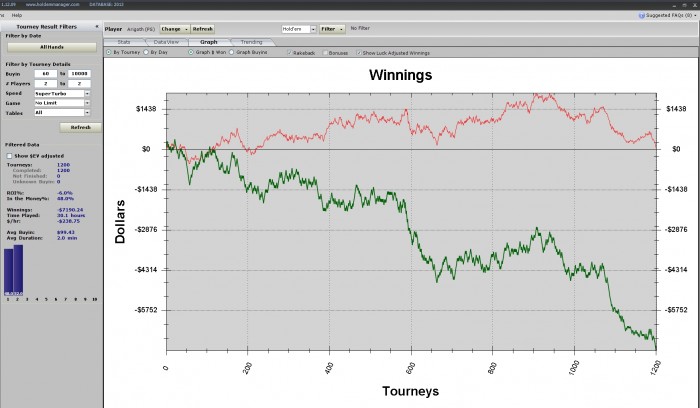1% ev roi - позор джунглям! Да, 1к турниров - это не дистанция даже для ев-линии. Да, кулеров было много. Но сути дела это не меняет. Я не выкладывался на 100% - и за это поплатился. Мне следовало усилить селекцию и на время перейти на один стол. Вместо этого я закончил, играя с регом на двух столах на полуавтомате. Без комментариев.