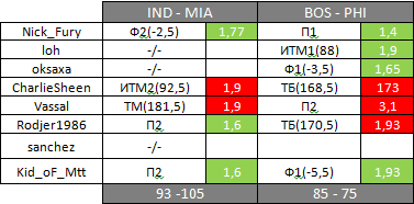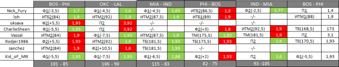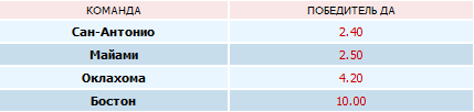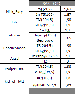 Ставки на победителя. За Бостон (кф. 10) - CharlieSheen, Vassal За Оклахому (кф. 4,2) - loh, Nick_Fury,oksaxa,Rodjer1986 За Сан Антонио (кф. 2,4) - Kid_oF_Mtt