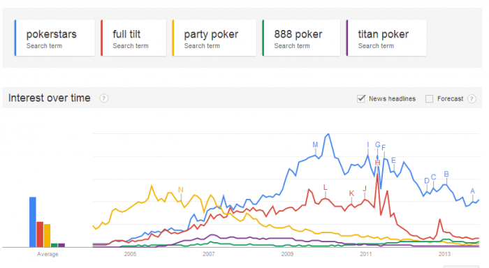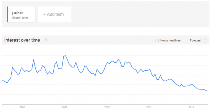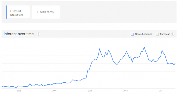 Вот график по запросам с гугл трендс, думаю он относительно точно показывает популярность онлайн покера:
