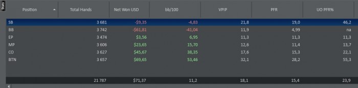 SB: $13.22 - VPIP: 20, PFR: 20, 3B: 0, AF: 0,0, Hands: 15