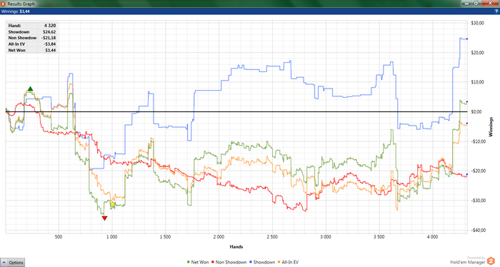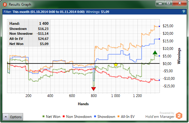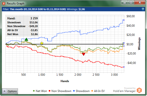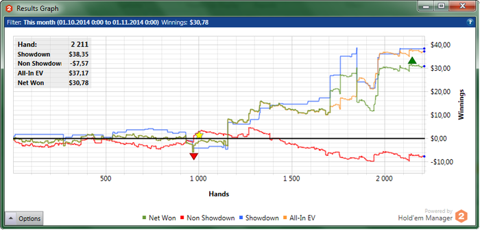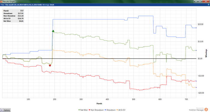 "Потому что донышко.." НЛ10 за текущий октябрь. Красная просто медленно стремиться в задницу... В принципе, винрейт норм - 5.44. Просто сцыкатно играть раздачу на весь стек, боясь потерь 10 баксов, но думаю с БРом около 50би посмелею.. Буду стараться по тихоньку расти :) пишите, задавайте вопросы)