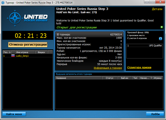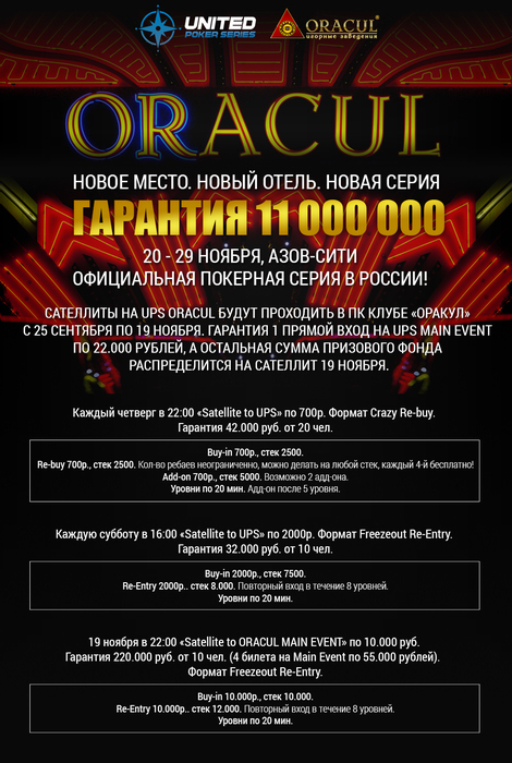 UPS Main Event с начальным стэком 20.000 DeepStack 6-Max Event с начальным стэком 50.000 ORACUL Poker Cup с начальным стэком 30.000