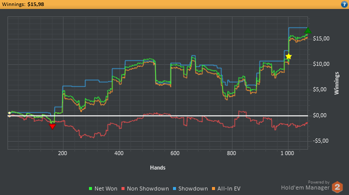 Здесь на флопе я чекаю, чтобы добраться бесплатно до ривера, т.к. на данный момент либо я далеко позади, либо впереди, пока непонятно. На терне я, скорее всего, позади, но у меня появилось сильное ФД. Шансы банка 28 = 0,40\(0,65+0,40+0,40), шансы доезда флэша - 18%, явно не хватает для колла. Но есть вероятности того, что BB блефует, а БТН заколлирует, тогда ШБ будут уже 22%, что хорошо. Ривер показал, что ББ не блефует и нам доехала дама. Но в расчет мы её не брали, т.к. в мультипоте наличие туза крайне возможно, не говоря уже о флэшах, стритах и сэтах, поэтому мы пасуем. Как-то так.