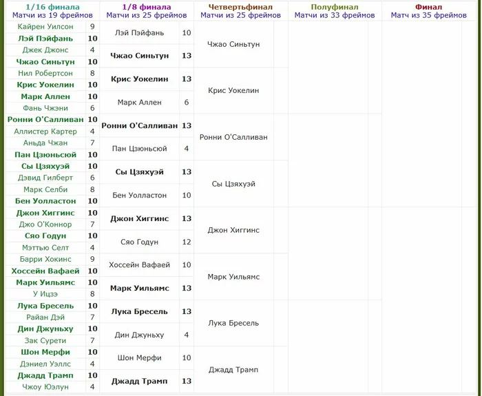 Ну, так как у меня появился последователь, дублировать табличку фэнтези не буду. Но слежу за правильным вычеркиванием и подсчетом ) А вот турнирную сетку закину для порядка ) Ход самого турнира по результатам, в том числе неожиданным, довольно интересный. Посмотрим, сможет ли Ронни дойти хотя бы до финала. С его то соперниками по сетки, главное только его личный настрой. А вот в нижней части турнирной таблице, заруба должна быть плотной и интересной.
