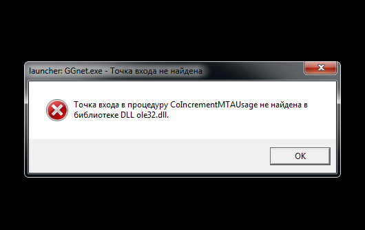 Господа!!! Кто-нибудь сталкивался с ошибкой "Точка входа в процедуру CoIncrementMTAsage не найдена в библиотеке DLL ole32.dll."? Появляется при загрузке клиента Покерок, Windows 7. Заранее Спасибо.