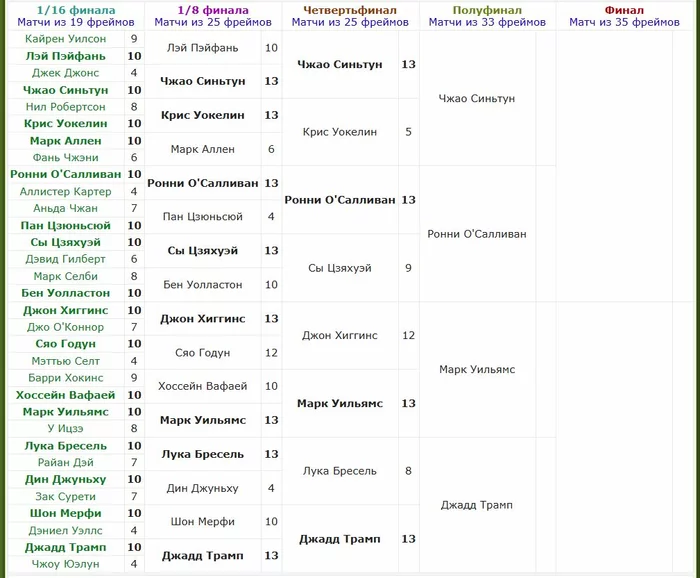 Отличный чемпионат! Рад что выиграл молодой из Китая. Думаю, что благодаря этому факту в следующем сезоне прилично вырастут призовые в рейтинговых турнирах. И сам, с 2006г.смотрел первый раз снукер, без Синицына) на кике. Понравилось больше. Все матчи практически смотрел. В первый раз занял призовое место, и был в одном шаре от победы в фентези) когда Хиггинс с 12-8 сделал 12-12, и учитывая то что, в решающих фреймах в Крусибле, он 1 раз из 10 проигрывал, на синем ощущение было такое, как будто ты выставился на флопе против оверпары, на терне поймал сет, и ривером доехал сет старше). Но я не расстроился, Уильямс заслужил ту победу, и в дальнейшем это доказал, обыграв 1 номера, рекордсмена по сенчури, и реально самого стабильного и техничного Трампа. А в Синьтуне сомнений не было. Как-то легко он всех проходил. Надеюсь у них с Трампом еще будет много заруб за топ1 снукера. Уильямс легенда!